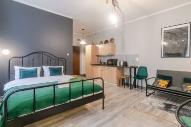 Strzelecka Central Studio składa się z salonu z rozkładaną kanapą (tzw. leżanką) oraz łóżkiem typu king size, aneksu kuchennego oraz łazienki. W apartamencie dostępne są: Wi-Fi, telewizja naziemna, lodówka z zamrażalnikiem, kuchenka elektryczna, mikrofalówka, czajnik, ekspres kapsułkowy. W domu znajdują się także żelazko, odkurzacz i suszarka do włosów. Goście mogą również korzystać z miejsca parkingowego bez gwarancji wolnego miejsca, z możliwością wystąpienia opłat.