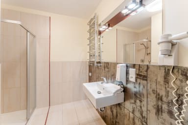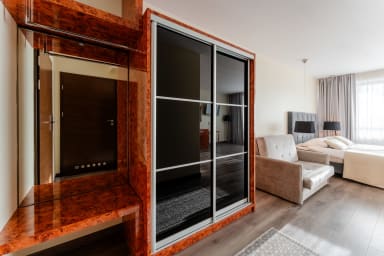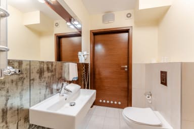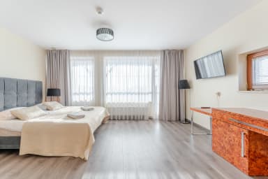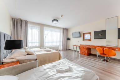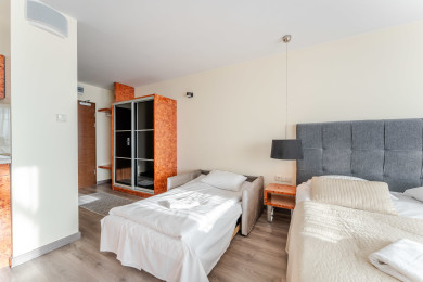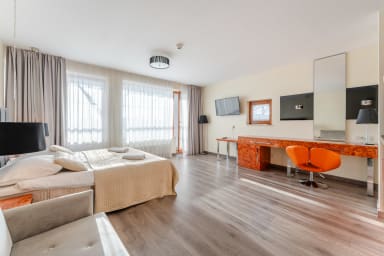 Na miejscu dostępne są dodatkowo płatne udogodnienia, z których Goście mogą korzystać bezpośrednio w części hotelowej, takie jak basen, sauna oraz centrum spa oferujące zabiegi relaksacyjne i masaże. Do dyspozycji jest również restauracja oraz pralnia samoobsługowa, co szczególnie docenią osoby planujące dłuższy pobyt. Dzięki tak szerokiej ofercie obiekt świetnie nadaje się zarówno na wypoczynek, jak i wygodne pobyty biznesowe — wszystkie udogodnienia dostępne są na miejscu, bez konieczności wychodzenia z budynku. Jeśli Goście zapragną relaksu, aktywności lub dobrej kolacji, wszystko znajduje się w zasięgu ręki.