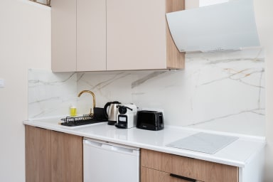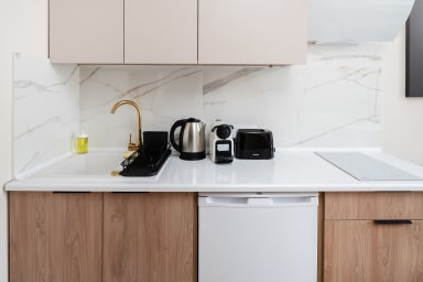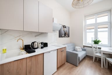 Łódź Downtown Studio 7A with Mezzanine to przytulnie urządzony apartament, który posiada salon z rozkładaną kanapą i aneksem kuchennym, antresolę z wygodnym materacem oraz łazienkę. Goście mają do dyspozycji szereg praktycznych udogodnień, w tym darmowe Wi-Fi, telewizor, pralkę, suszarkę bębnową, żelazko, suszarkę do włosów, lodówkę z zamrażarką, kuchenkę indukcyjną, toster, ekspres do kawy, czajnik oraz akcesoria kuchenne.