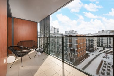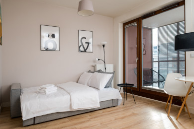 Business Mokotów Park 23 Studio to stylowo urządzony apartament, który posiada salon z rozkładaną kanapą i aneksem kuchennym, łazienkę oraz przestronny balkon, gdzie goście będą mogli odpocząć oraz napić się porannej kawy, czy wieczornej lampki wina. Oferuje szereg najwyższej klasy udogodnień, w tym telewizor, pralkę, suszarkę do włosów, żelazko, lodówkę z zamrażarką, zmywarkę, kuchenkę indukcyjną, piekarnik, czajnik oraz akcesoria kuchenne.