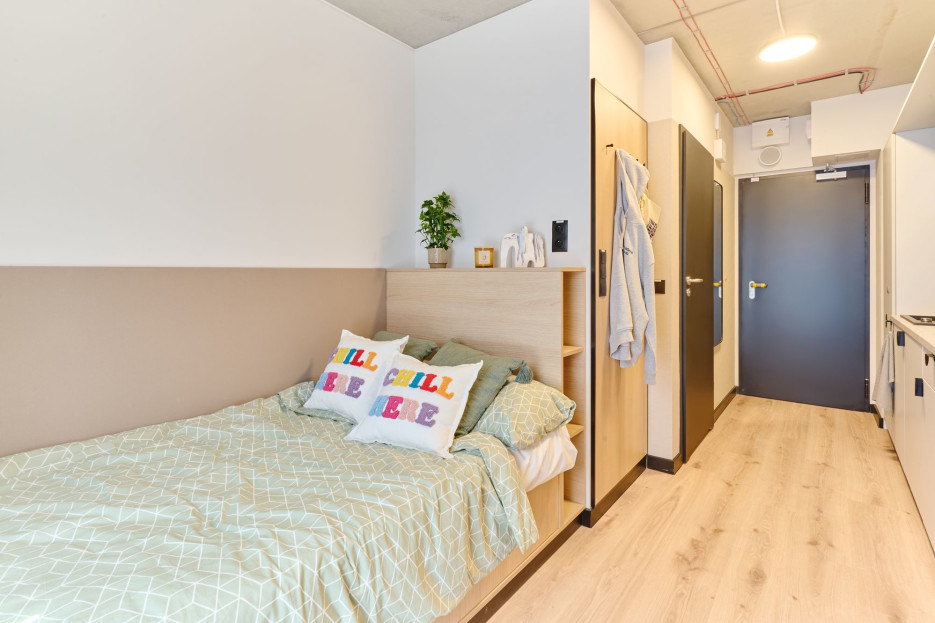 Na terenie obiektu znajduje się lobby, całodobowa ochrona, siłownia, strefa work&chill, gdzie można pograć w PS5 albo po prostu posiedzieć i porozmawiać z nowymi znajomymi z akademika, a także pokoje cichej nauki/pracy i relaksu, w których możesz skorzystać z drukarki, jeśli zachodzi taka potrzeba, w pobliżu znajduje się również fryzjer oraz sklep Żabka, w którym można nabyć artykuły pierwszej potrzeby.