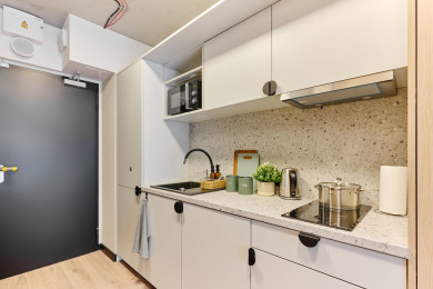 Goście mają do dyspozycji nowoczesne i funkcjonalnie urządzone pokoje. Dysponują one prywatną łazienką oraz aneksem kuchennym wyposażonym w kuchenkę mikrofalową, lodówkę i czajnik elektryczny oraz płytę kuchenną. Apartament wyposażony jest również w łóżko, biurko oraz szafę.