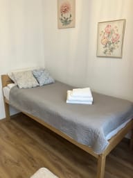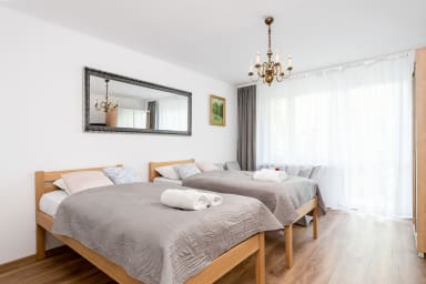 Apartament oferuje dwie osobne sypialnie – jedna wyposażona w dwa wygodne łóżka pojedyncze, druga w jedno łóżko pojedyncze – co zapewnia prywatność i komfort wszystkim gościom. Do dyspozycji pozostaje również nowoczesna łazienka oraz balkon, idealny na poranną kawę lub wieczorny relaks z kieliszkiem wina.