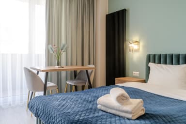 Business Deluxe Studio 58 posiada pokój z wygodnym łóżkiem typu king size i aneksem kuchennym, łazienkę oraz przestronny balkon, gdzie goście będą mogli odpocząć oraz napić się porannej kawy, czy wieczornej lampki wina. Goście mają do dyspozycji rozmaite udogodnienia, w tym: darmowe WiFi, telewizor, pralkę, żelazko, suszarkę do włosów, kuchenkę indukcyjną, zmywarkę, lodówkę z zamrażarką, toster, ekspres do kawy, czajnik oraz akcesoria kuchenne. Ponadto apartament posiada klimatyzację, co daje niezwykły komfort, zwłaszcza w trakcie upalnych dni.