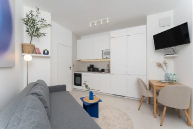 Cracow Novum Apartment #533 to stylowo urządzony apartament, który posiada salon z rozkładaną kanapą i aneksem kuchennym, sypialnię z wygodnym łóżkiem małżeńskim oraz łazienkę. Goście mają do dyspozycji szereg praktycznych udogodnień, w tym darmowe Wi-Fi, telewizję, sejf, pralkę, żelazko, suszarkę do włosów, lodówkę z zamrażarką, zmywarkę, piekarnik, kuchenkę indukcyjną, mikrofalówkę, toster, ekspres przelewowy, czajnik oraz akcesoria kuchenne.