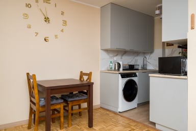 Żuromińska Comfort Studio to stylowo urządzony apartament, który posiada salon z rozkładaną kanapą i aneksem kuchennym oraz łazienkę. Goście mają do dyspozycji szereg praktycznych udogodnień, w tym: darmowe WiFi, telewizor, żelazko, pralkę, suszarkę do włosów, zmywarkę, lodówkę z zamrażarką, kuchenkę gazową, mikrofalówkę, piekarnik oraz akcesoria kuchenne.