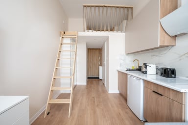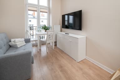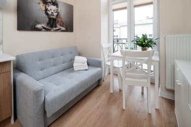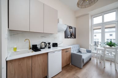 Łódź Downtown Studio 7B with Mezzanine to przytulnie urządzony apartament, który posiada salon z rozkładaną kanapą i aneksem kuchennym, antresolę z wygodnym materacem oraz łazienkę. Goście mają do dyspozycji szereg praktycznych udogodnień, w tym darmowe Wi-Fi, telewizor, pralkę, suszarkę bębnową, żelazko, suszarkę do włosów, lodówkę z zamrażarką, kuchenkę indukcyjną, toster, ekspres do kawy, czajnik oraz akcesoria kuchenne.
